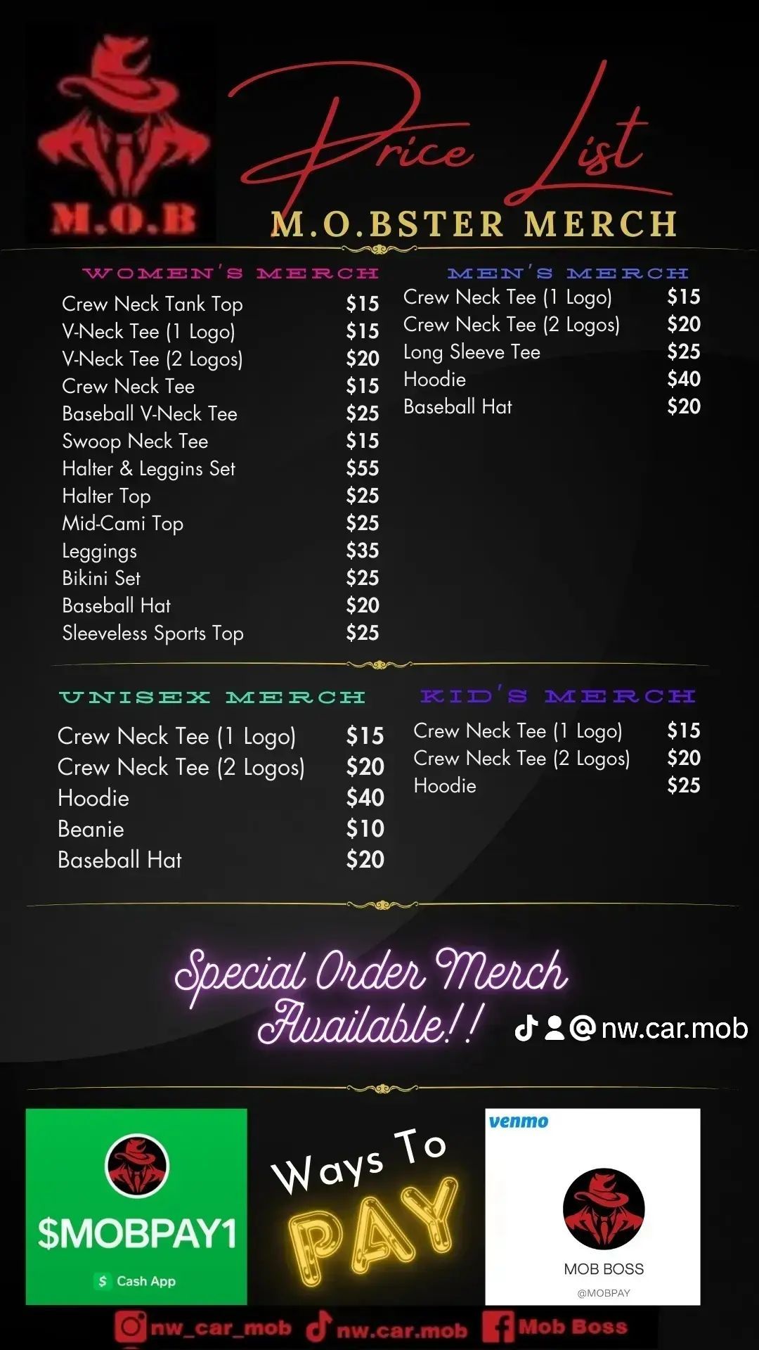 Mob Boss, Instagram nw_car_mob or TikTok nw.car.mob for the full clothing line and special order requests.